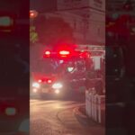 北九州市戸畑区内の建物火災現場に緊急走行で現着する、北九州市消防局八幡東消防署 30m級梯子車”ほくしょう609″。